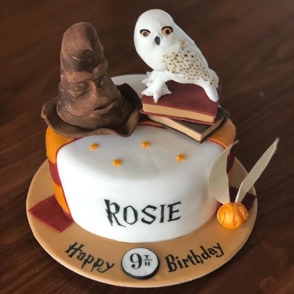 For the aspiring witch or wizard in your life, be they 7 or 37, this Harry Potter inspired cake is sure to delight. Hedwig perches atop a couple of heavy looking wizarding books, alongside a rather dusty looking sorting hat, a school scarf and the golden snitch. Beautifully hand painted with your chosen name and... Continue Reading →